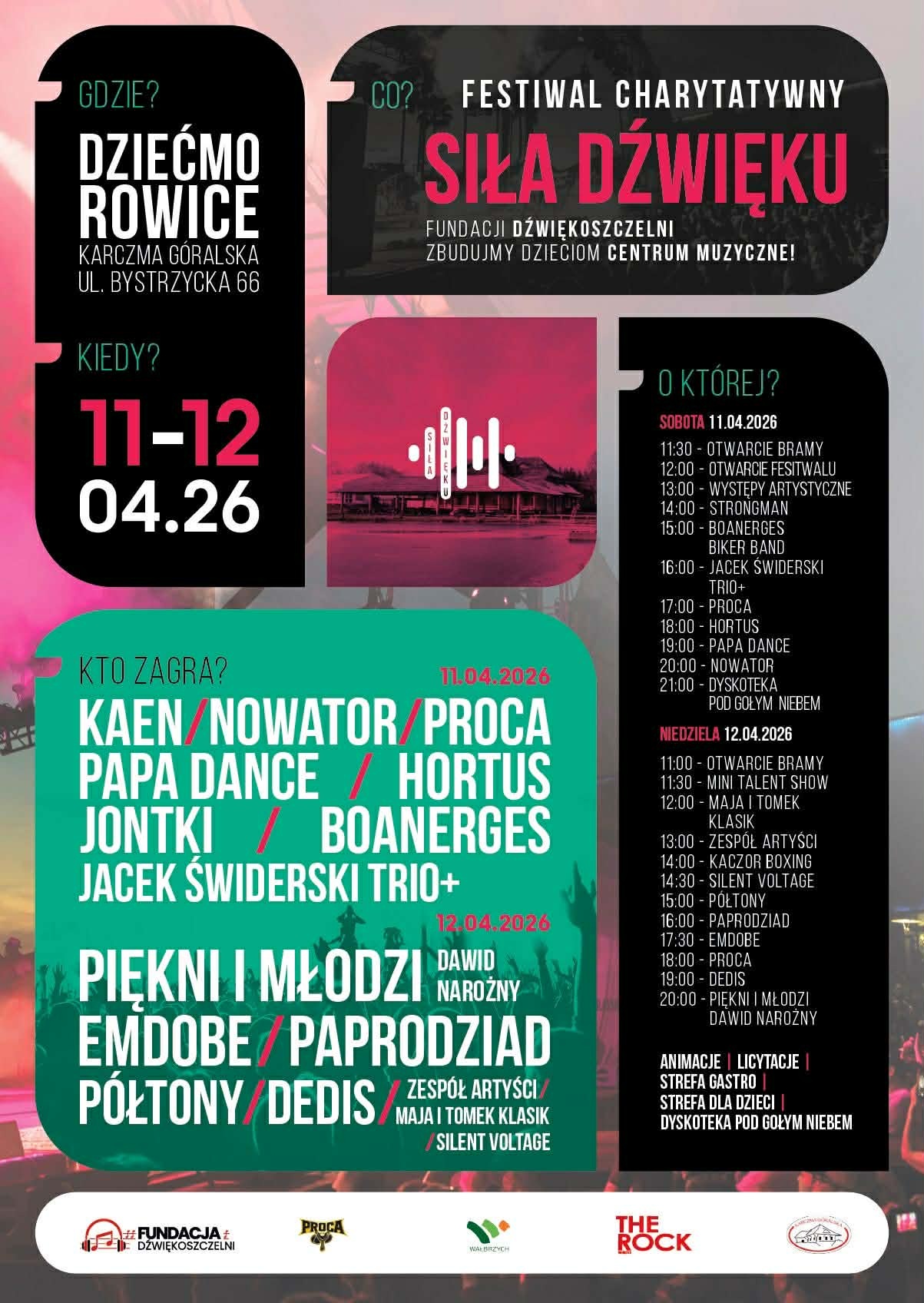 W dniach 11–12 kwietnia 2026 roku w Karczmie Góralskiej w Dziećmorowicach odbędzie się charytatywny festiwal muzyczny „”, Siła Dźwiękuorganizowany przez Fundację Dźwiękoszczelni. Wydarzenie połączy koncerty, atrakcje dla całych rodzin oraz działania wspierające szczytny cel, jakim jest zbiórka środków na budowę centrum muzycznego dla dzieci i młodzieży.